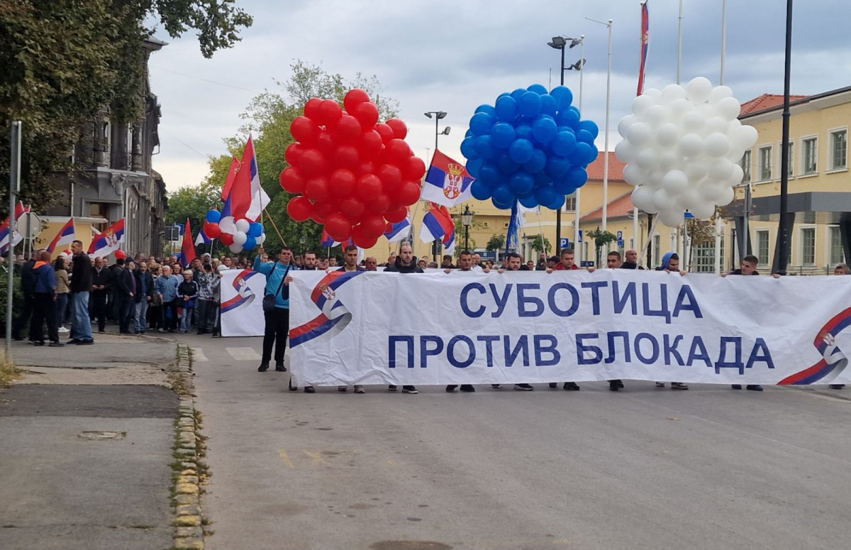 Окупљање под називом „Грађани против блокада“ пратили су транспаренти „Суботица против блокада“ и „Не дамо Србију“, а потом су окупљени грађани пустили балоне у бојама српске заставе.